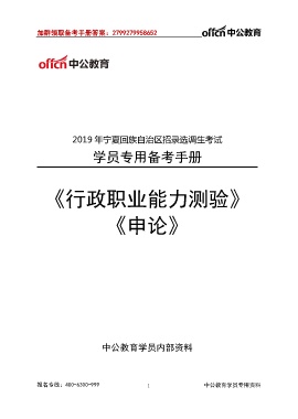 加群领取备考手册答案:2799279958652 2019 年宁夏回族自治区招录选调生考试 学员专用备考手册 《行政职业能力测验》 《申论》 中公教育学员内部资料 报名专线:400-6300-999 1 中公教育学员专用资料